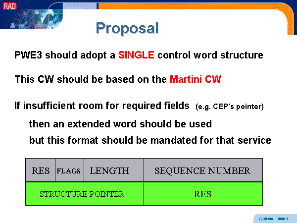Proposal PWE3 should adopt a SINGLE control word structure This CW should be based on the Martini CW If insufficient room for required fields (e.g. CEP’s pointer) then an extended word should be used but this format should be mandated for that service RES STRUCTURE POINTER |
