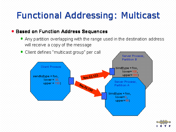 Server Process, Partition B Server Process, Partition A Client Process bind(type = foo, lower=0, upper=99) sendto(type = foo, lower = 33, upper = 133) bind(type = foo, lower=100, upper=199) foo,33,133 foo,33,133 Functional Addressing: Multicast Based on Function Address Sequences Any partition overlapping with the range used in the destination address will receive a copy of the message Client defines “multicast group” per call |