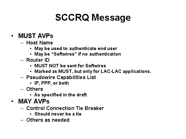 SCCRQ Message MUST AVPs Host Name May be used to authenticate end user May be “Softwires” if no authentication Router ID MUST NOT be sent for Softwires Marked as MUST, but only for LAC-LAC applications. Pseudowire Capabilities List IP, PPP, or both Others As specified in the draft MAY AVPs Control Connection Tie Breaker Should never be a tie Others as needed |