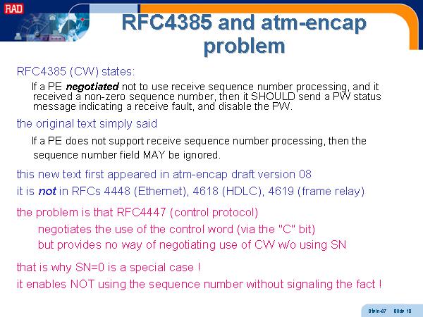 RFC4385 and atm-encap problem RFC4385 (CW) states: If a PE negotiated not to use receive sequence number processing, and it received a non-zero sequence number, then it SHOULD send a PW status message indicating a receive fault, and disable the PW. the original text simply said If a PE does not support receive sequence number processing, then the sequence number field MAY be ignored. this new text first appeared in atm-encap draft version 08 it is not in RFCs 4448 (Ethernet), 4618 (HDLC), 4619 (frame relay) the problem is that RFC4447 (control protocol) negotiates the use of the control word (via the "C" bit) but provides no way of negotiating use of CW w/o using SN that is why SN=0 is a special case ! it enables NOT using the sequence number without signaling the fact ! |