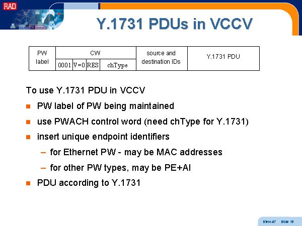 Y.1731 PDUs in VCCV To use Y.1731 PDU in VCCV PW label of PW being maintained use PWACH control word (need chType for Y.1731) insert unique endpoint identifiers for Ethernet PW - may be MAC addresses for other PW types, may be PE+AI PDU according to Y.1731 |