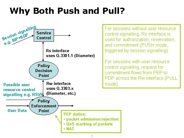Why Both Push and Pull? Service Control Session signalling e.g. SIP+SDP Policy Decision Point Policy Enforcement Point User Data Possible user resource control signalling e.g. RSVP Rs interface uses Q.3301.1 (Diameter) Rw interface uses Q.3303.x (Diameter, etc.) PEP duties: packet admission/rejection QoS marking of packets NAT For sessions without user resource control signalling, Rs interface is used for authorization, reservation, and commitment (PUSH mode, triggered by session signalling). For sessions with user resource control signalling, request for commitment flows from PEP to PDP across the Rw interface (PULL mode). |