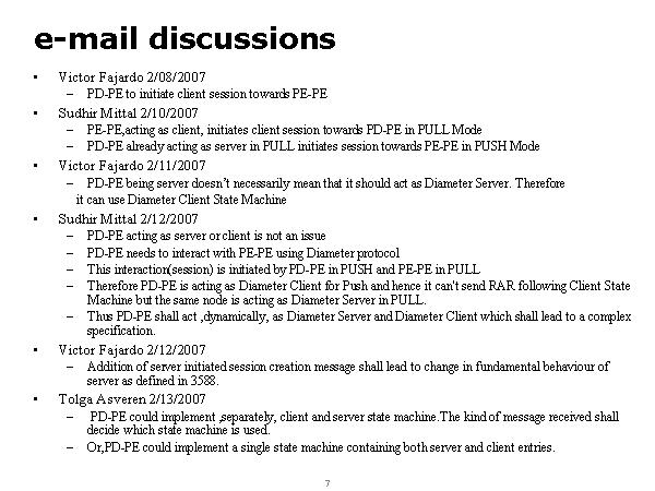 e-mail discussions Victor Fajardo 2/08/2007 PD-PE to initiate client session towards PE-PE Sudhir Mittal 2/10/2007 PE-PE,acting as client, initiates client session towards PD-PE in PULL Mode PD-PE already acting as server in PULL initiates session towards PE-PE in PUSH Mode Victor Fajardo 2/11/2007 PD-PE being server doesn’t necessarily mean that it should act as Diameter Server. Therefore it can use Diameter Client State Machine Sudhir Mittal 2/12/2007 PD-PE acting as server or client is not an issue PD-PE needs to interact with PE-PE using Diameter protocol This interaction(session) is initiated by PD-PE in PUSH and PE-PE in PULL Therefore PD-PE is acting as Diameter Client for Push and hence it can't send RAR following Client State Machine but the same node is acting as Diameter Server in PULL. Thus PD-PE shall act ,dynamically, as Diameter Server and Diameter Client which shall lead to a complex specification. Victor Fajardo 2/12/2007 Addition of server initiated session creation message shall lead to change in fundamental behaviour of server as defined in 3588. Tolga Asveren 2/13/2007 PD-PE could implement ,separately, client and server state machine.The kind of message received shall decide which state machine is used. Or,PD-PE could implement a single state machine containing both server and client entries. |