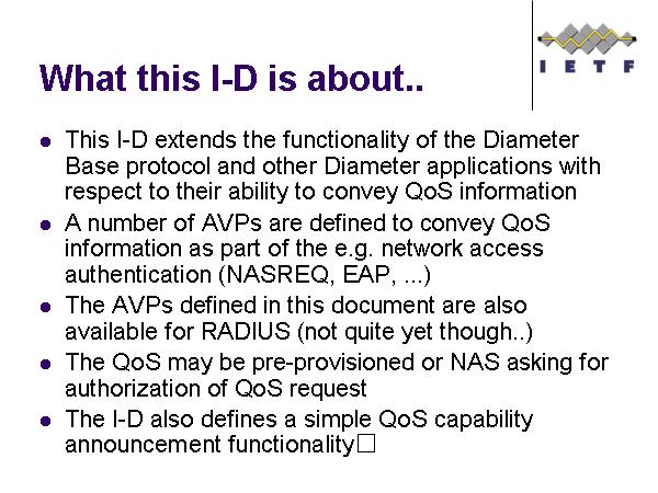 What this I-D is about.. This I-D extends the functionality of the Diameter Base protocol and other Diameter applications with respect to their ability to convey QoS information A number of AVPs are defined to convey QoS information as part of the e.g. network access authentication (NASREQ, EAP, ...) The AVPs defined in this document are also available for RADIUS (not quite yet though..) The QoS may be pre-provisioned or NAS asking for authorization of QoS request The I-D also defines a simple QoS capability announcement functionality |