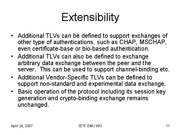 Extensibility Additional TLVs can be defined to support exchanges of other type of authentications, such as CHAP, MSCHAP, even certificate-base or bio-based authentication. Additional TLVs can also be defined to exchange arbitrary data exchange between the peer and the server. This can be used to support channel-binding etc. Additional Vendor-Specific TLVs can be defined to support non-standard and experimental data exchange. Basic operation of the protocol including its session key generation and crypto-binding exchange remains unchanged. |