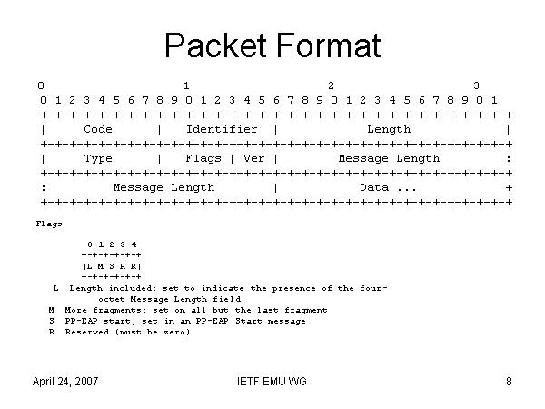 Packet Format 0 1 2 3 0 1 2 3 4 5 6 7 8 9 0 1 2 3 4 5 6 7 8 9 0 1 2 3 4 5 6 7 8 9 0 1 +-+-+-+-+-+-+-+-+-+-+-+-+-+-+-+-+-+-+-+-+-+-+-+-+-+-+-+-+-+-+-+-+ | Code | Identifier | Length | +-+-+-+-+-+-+-+-+-+-+-+-+-+-+-+-+-+-+-+-+-+-+-+-+-+-+-+-+-+-+-+-+ | Type | Flags | Ver | Message Length : +-+-+-+-+-+-+-+-+-+-+-+-+-+-+-+-+-+-+-+-+-+-+-+-+-+-+-+-+-+-+-+-+ : Message Length | Data ... + +-+-+-+-+-+-+-+-+-+-+-+-+-+-+-+-+-+-+-+-+-+-+-+-+-+-+-+-+-+-+-+-+ Flags 0 1 2 3 4 +-+-+-+-+-+ |L M S R R| +-+-+-+-+-+ L Length included; set to indicate the presence of the four- octet Message Length field M More fragments; set on all but the last fragment S PP-EAP start; set in an PP-EAP Start message R Reserved (must be zero) |